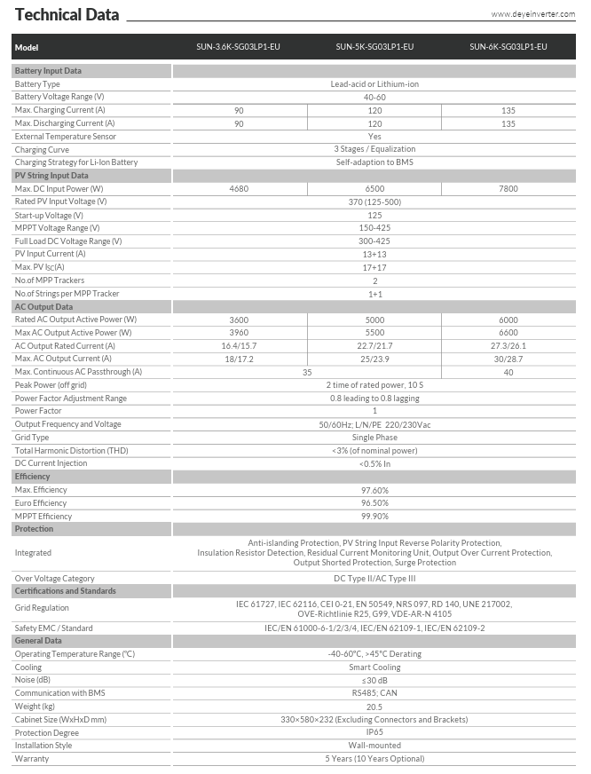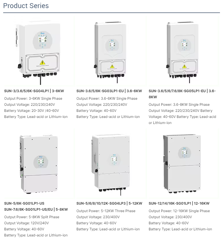 DEYE Hybrid Inverter Single Phase 5kW, 6kW, 8kW, Output Voltage 120V/240V, Battery Voltage 40V – 60V
