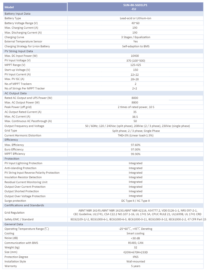 Specifications of DEYE Hybrid Inverter Single Phase 5kW, 6kW, 8kW, Output Voltage 120V/240V, Battery Voltage 40V – 60V