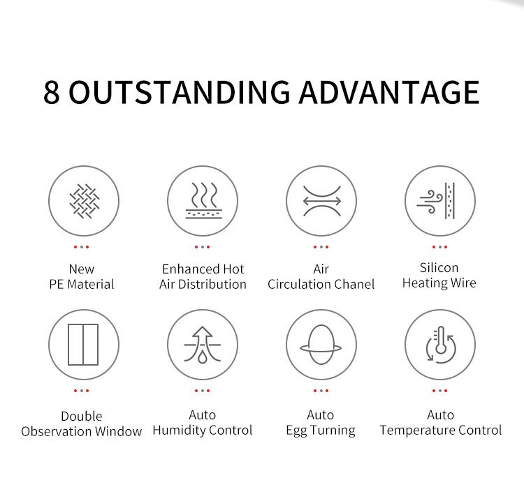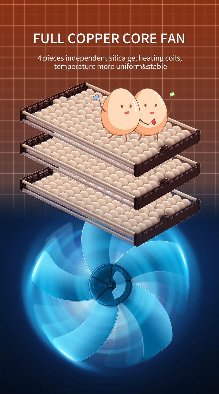 High quality fan with long lifetime,supports to distribute temperature & humidity evenly to every corner to ensure stable hatching rate